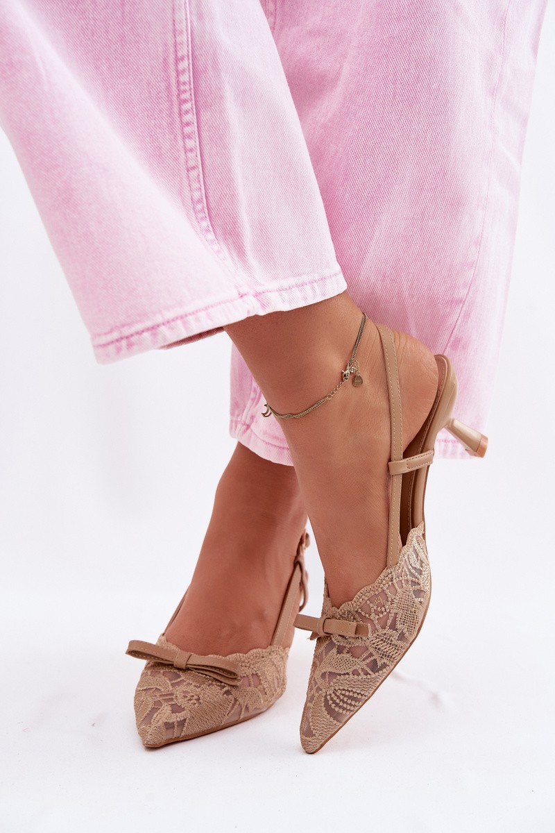 Women's Lace Heeled Sandals With Bow Beige Maribelle