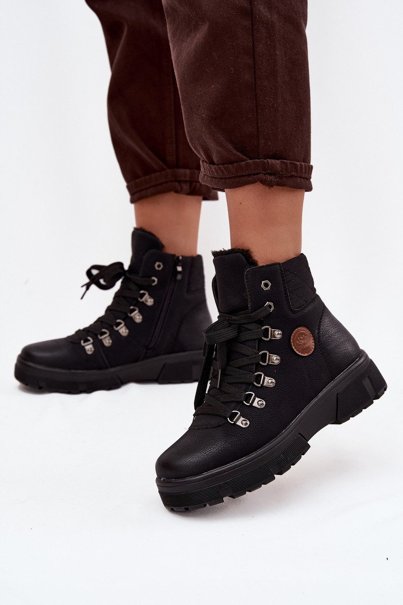 Women's ankle boots made from eco leather are a stylish and practical option for colder days. Set on a sturdy platform, they provide stability and comfort while walking. The interior is lined with soft fur to ensure warmth and comfort, making these shoes excellent for winter days. The model features both laces and a zipper, which makes putting them on easier and allows for a perfect fit. These versatile ankle boots will perfectly complement your everyday outfits. When choosing a size, please refer to the size chart. When choosing a size, please refer to the size chart.