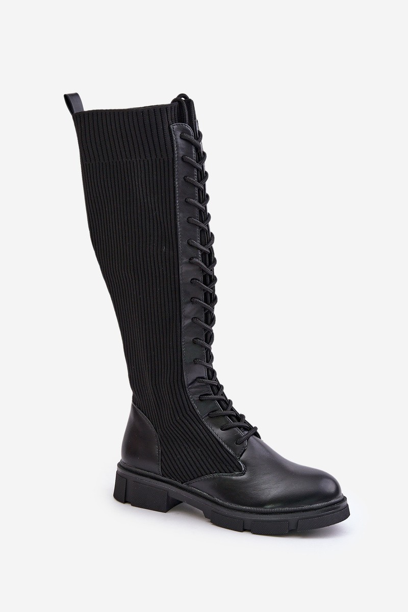 Women's boots made of a combination of eco leather and textile material. The model features rounded toes that provide comfort during wear. The interior of the shoes is insulated with a shoe fleece only up to the height of the foot. The elastic shaft with lacing adds a trendy, stylish look to the whole. These boots pair well with a variety of outfits, both casual and more elegant. When choosing a size, please refer to the size chart.