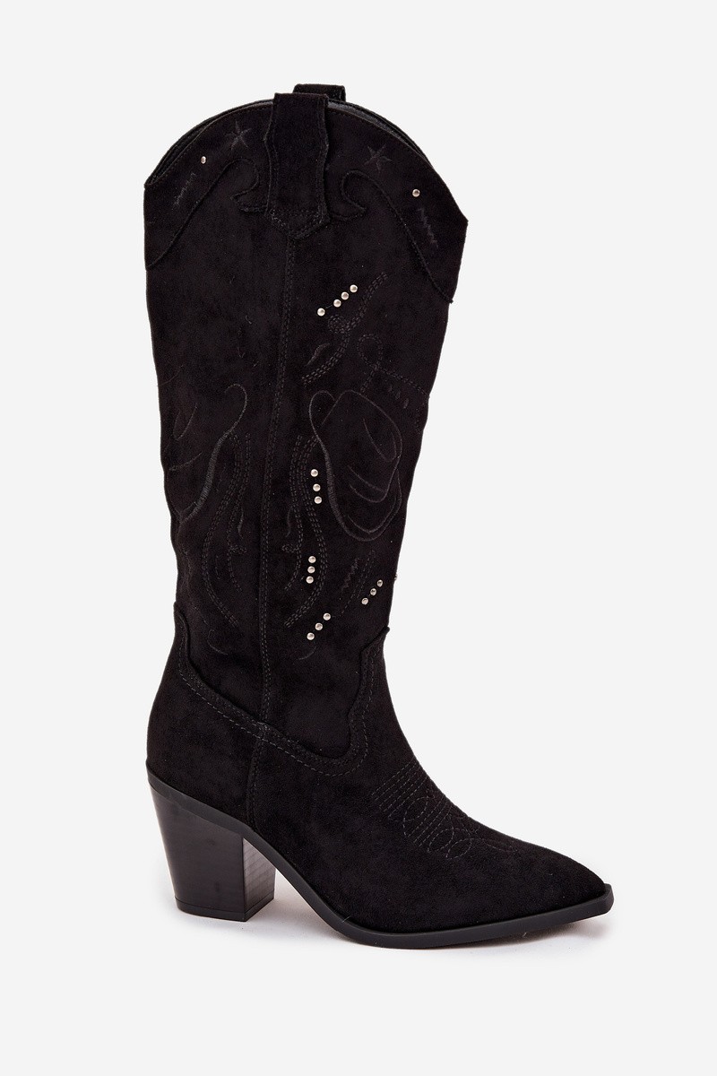 Women's cowboy-style boots made from eco suede are a proposal that combines classic style with a trendy, expressive character. Set on a stable, tapered block heel, they add slenderness to the silhouette while ensuring comfort when walking. The model features decorative stitching and subtle gold accents. Almond-shaped toes emphasize a feminine style, and a practical zipper located at the bottom of the shaft makes donning easier. These boots are perfect for autumn and winter outfits – they pair well with both fitted trousers and boho-style dresses. When choosing a size, please refer to the size chart. When choosing a size, please refer to the size chart.