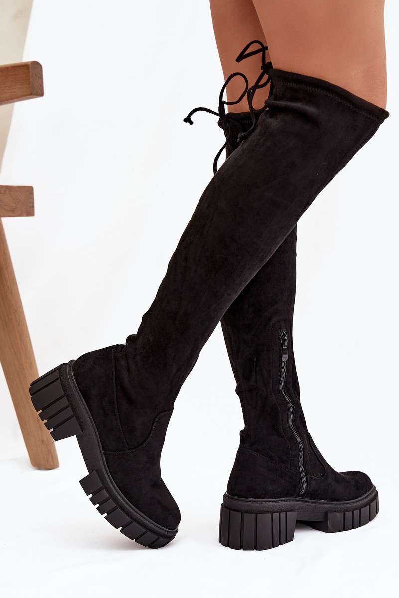 Beautiful women's boots with uppers above the knee. The model is made of pleasant to the touch eco suede. Fastened with a zipper on the side of the upper. In addition, the boots have a binding, thanks to which they can be properly adjusted. The model is mounted on a massive flat heel and a platform. The boots have insulation in the form of a footwear blanket only at the height of the foot. Stiffened heel. When choosing a size, please use the size chart.