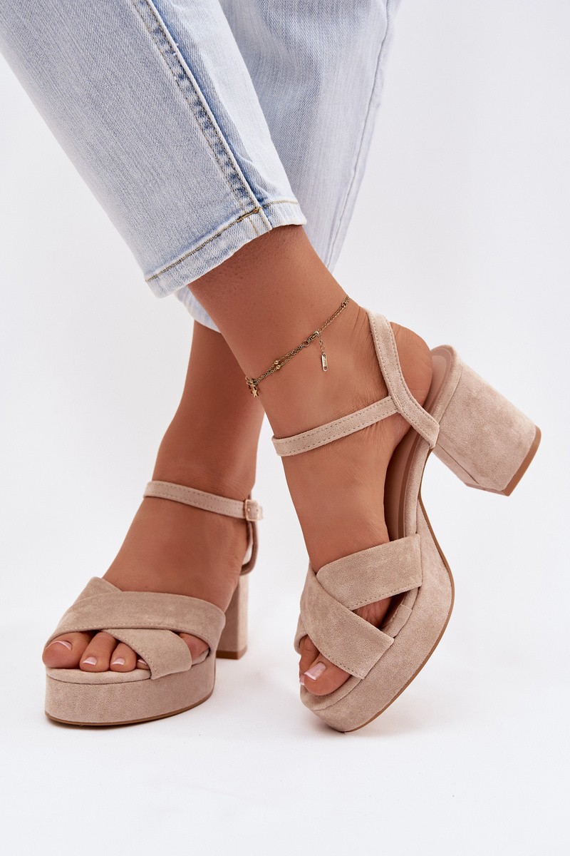Women's sandals made from eco suede. The model with a stable block heel and platform provides comfort and confidence with every step while accentuating the silhouette. Two interwoven straps at the front stylishly expose the foot and add a fashionable touch. The adjustable strap with a buckle allows for a perfect fit. This model is ideal for both everyday wear and special occasions. When choosing a size, please refer to the size chart.