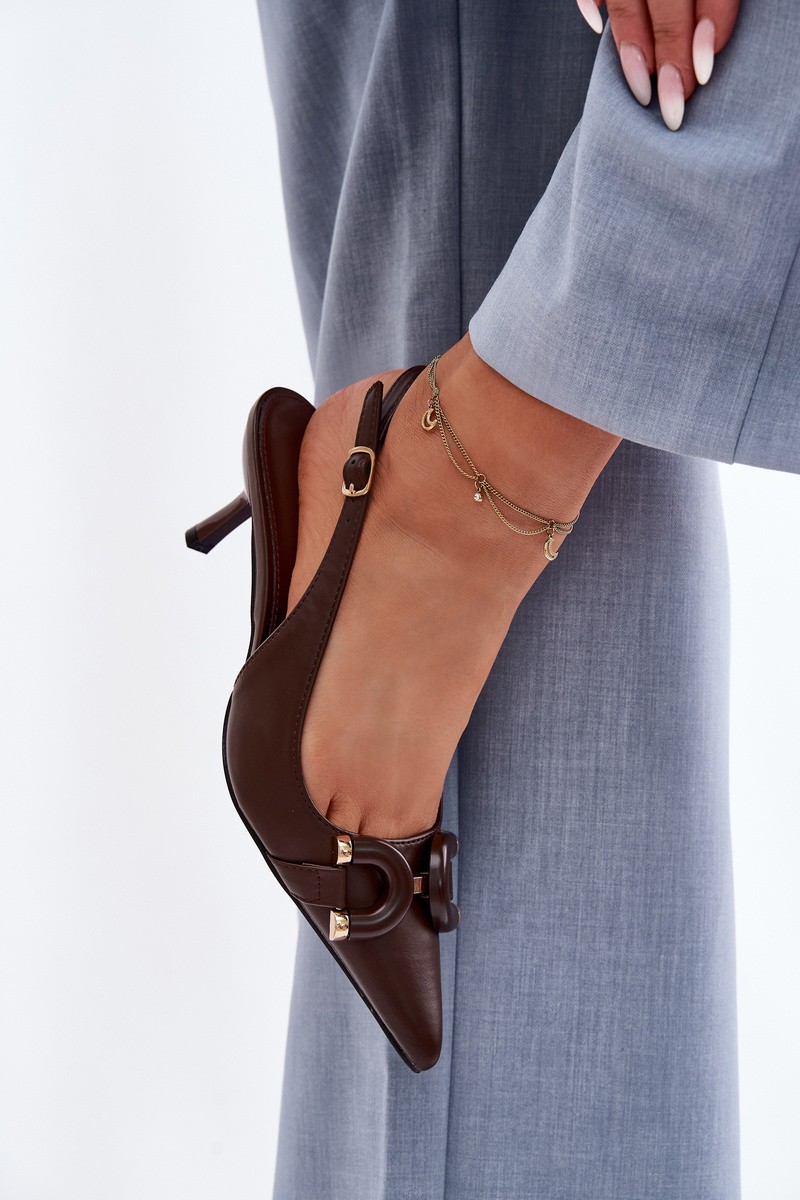 Women's sandals made from eco leather are a stylish option for special occasions. Covered, pointed toes give them a classic and feminine character, and the decorative detail at the front draws attention and highlights the elegance of the model. The slender heel beautifully elongates the silhouette and adds sophistication. The model with a buckle and adjustable strap allows for a perfect fit, ensuring comfort and stability while wearing. Sandals are perfect to complement many outfits, elegant dresses, and dressy occasions. When choosing a size, please refer to the size chart.