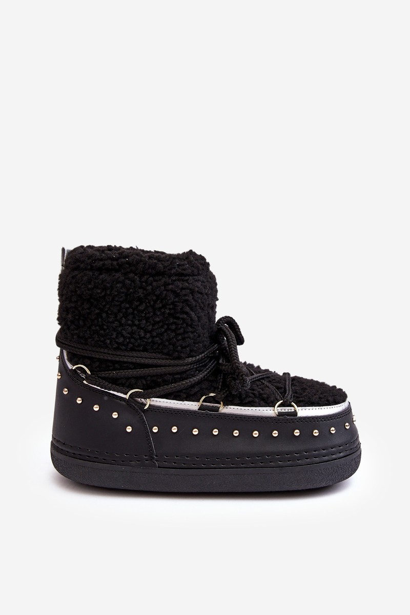 These unique women's snow boots have been made from cold and wind resistant material. The upper with faux fur and rivets will be perfect for the autumn-winter season. Classic slip-on model with additional lacing. The boots are set on a massive platform. They have an insulation of foam and a boot cover inside, which provides high protection on cold days. When choosing a size, please refer to the size chart.