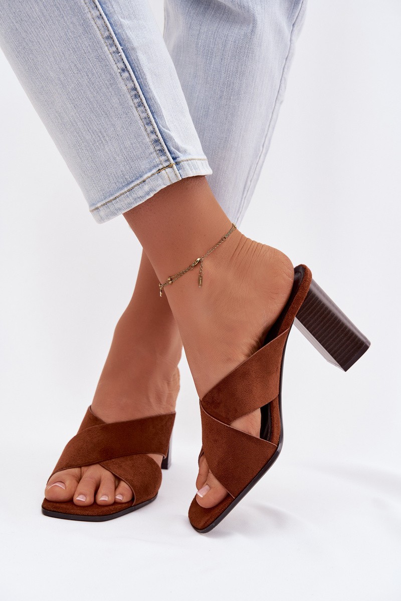 Stylish women's slippers made from eco suede. At the front, there are two interwoven straps that beautifully accentuate the foot and give the overall look a fashionable touch. The block heel provides stability and comfort, while adding a sense of lightness to the silhouette. This model is perfect for both everyday and more elegant summer styles. When choosing a size, please refer to the size chart.