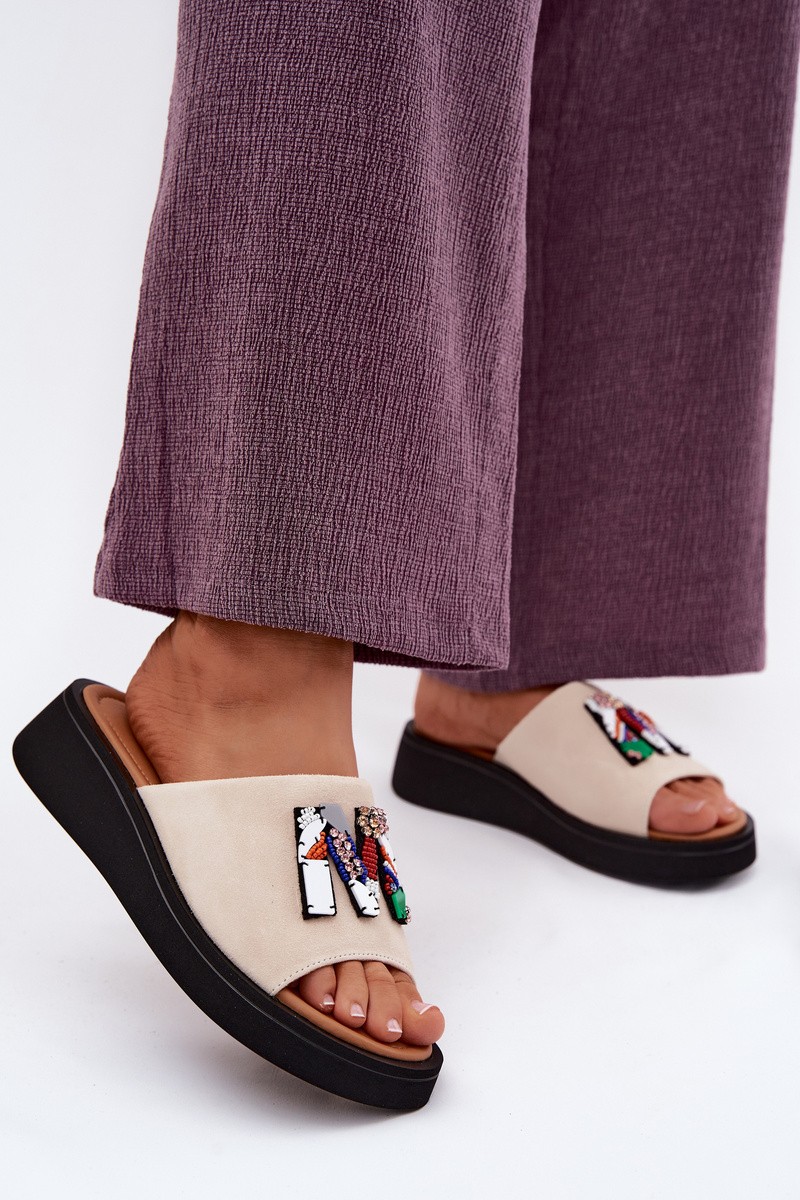 Women's slippers from Vinceza are a stylish and feminine choice for warm days. Made from natural suede, they look exceptionally elegant and perfectly complement summer outfits. The platform subtly elevates the silhouette while providing comfort while walking. An ornamental element with beads and rhinestones draws attention and gives the overall look a striking, jewelry-like character, making the model stand out from classic slippers. The leather insole increases wearing comfort, making these slippers suitable even for longer wear. An ideal choice for walks, meetings, or summer trips – anywhere comfort and style matter. When choosing a size, please refer to the size chart.