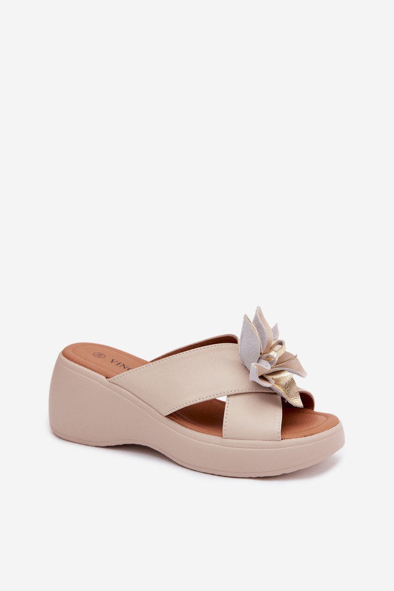 Leather Platform Sandals With Decorative Flower Vinceza 41511 Beige