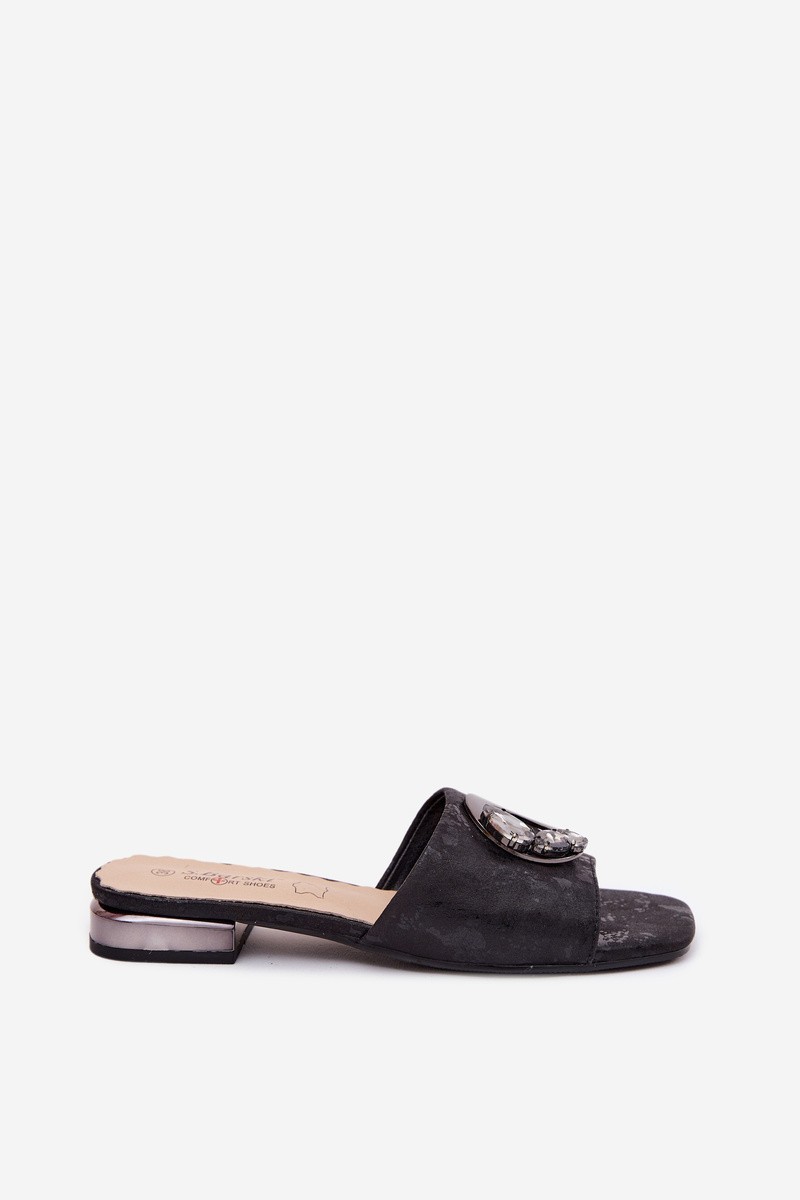 Women's eco leather slippers from S.Barski are an elegant option for warm days, combining style with comfort. The elegant design makes the model suitable for both everyday and more formal outfits. The flat heel provides walking comfort, and the soft insole made of natural leather of the comfort shoes type increases convenience even during extended wear. At the front, there is a decorative detail with crystals that attracts attention and adds a subtle shine to the whole. Perfect for walks, meetings, or summer outings when elegance and comfort matter. When choosing a size, please refer to the size chart.