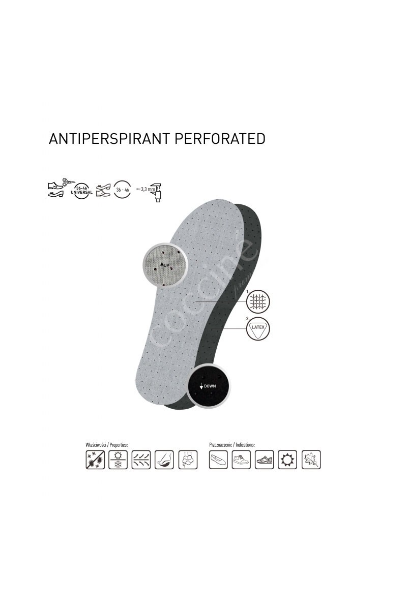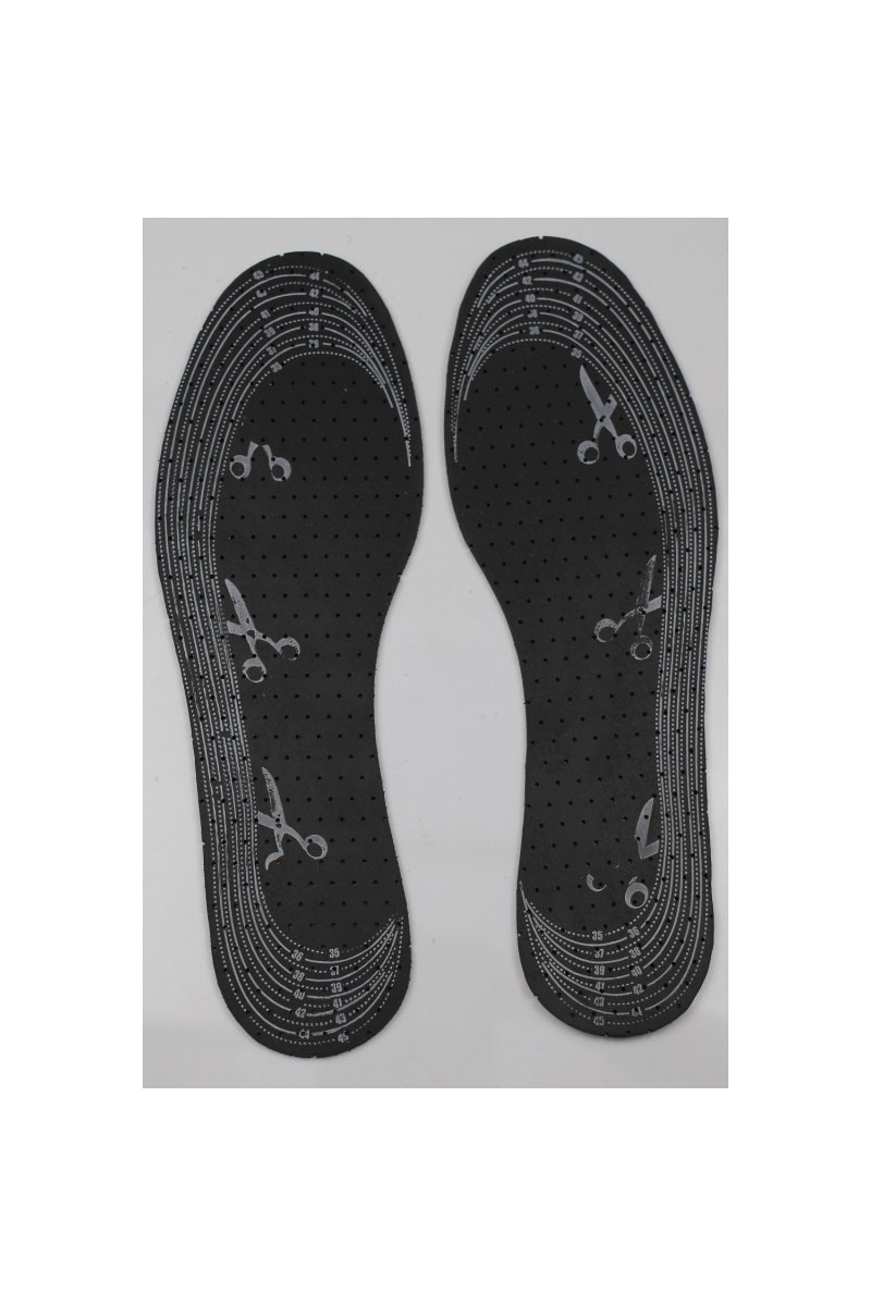 Sweat insoles made of latex foam perforated all over, containing fiber with active carbon. Perforation improves air circulation in the shoe. The carbon fiber absorbs unpleasant odors and also binds biologically active microorganisms, providing a feel of freshness. Covered with a thin cotton fabric, delicate and soft, the insole is recommended when there is significant stress on the feet, such as overweight, standing work or walking on hard ground.Activated carbon is an excellent absorber of many chemical compounds. A non-toxic substance used in medicine and industry.