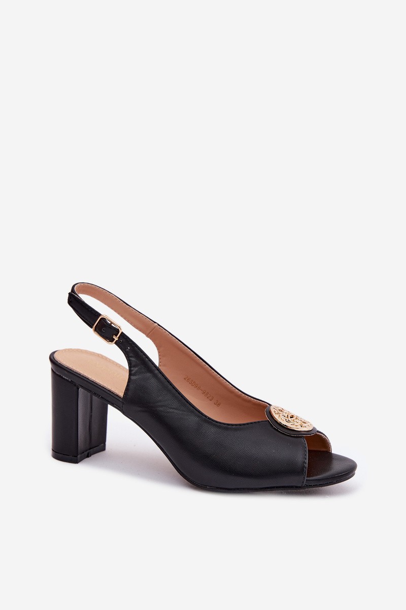 Women's eco leather sandals on a block heel are an elegant and comfortable choice for various occasions. Their classic design makes them a great match for both everyday and more formal outfits. The gold detail at the front draws attention and adds a stylish touch. The buckle closure allows for a perfect fit, and the leather insole enhances comfort. This model is ideal for meetings, celebrations, or evening outings, combining elegance with comfort. When choosing a size, please refer to the size chart.