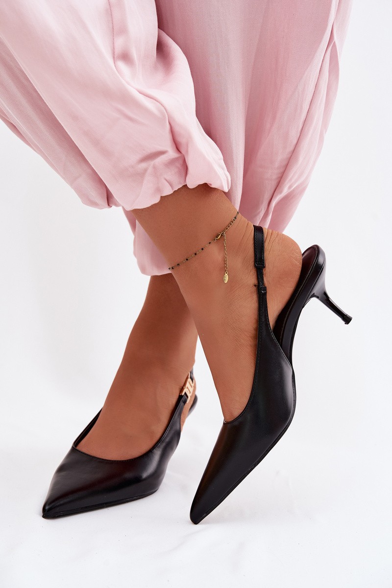 Elegant women's sandals made from faux leather are a unique choice for women who value style and a feminine appearance. They are perfect for special occasions, evening outings, and summer parties. The model features pointed toes that visually slim the foot. The slender heel emphasizes the silhouette, adding lightness and femininity. A subtle gold detail on the strap provides a fashionable accent that attracts attention and gives the overall look an elegant finish. This is an excellent combination of elegance, femininity, and modern style. When choosing a size, please refer to the size chart.