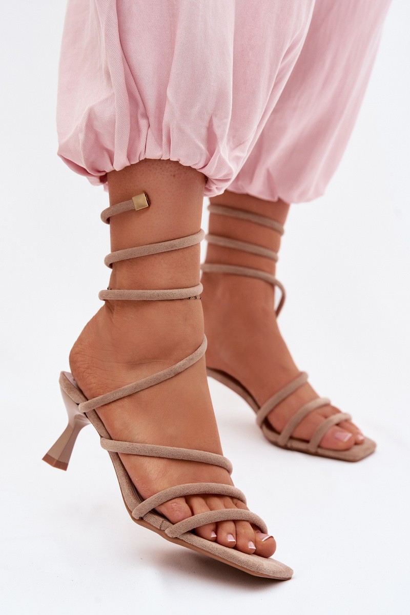 Women's sandals made of eco suede are the perfect choice for evening outings and special occasions such as weddings or parties. Their feminine and stylish design perfectly highlights the unique character of any outfit. The model features a slender heel. A distinctive element is the eye-catching strap wrapping around the leg, giving the whole look a sensual and fashionable appearance and ensuring a good fit. This is an excellent combination of elegance, comfort, and modern style – ideal for women who want to look exceptional and stylish. When choosing a size, please refer to the size chart.