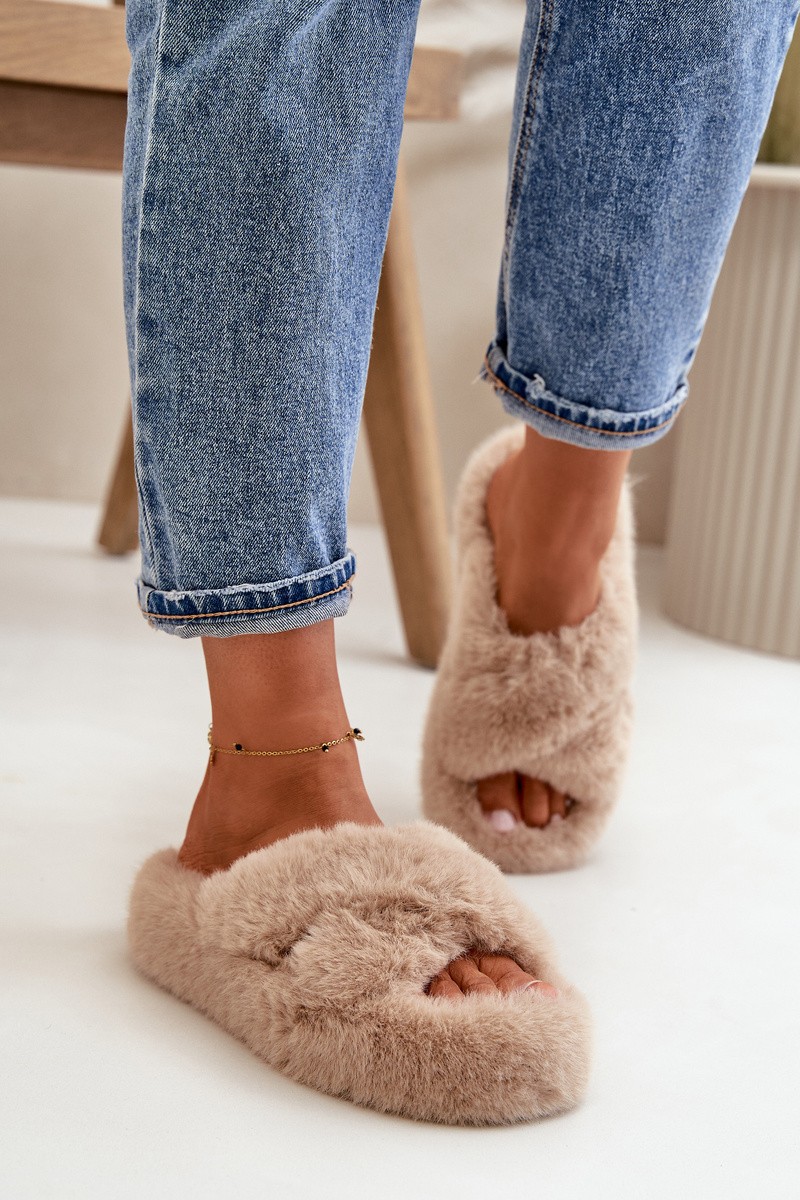 Moteriškos kailio šlepetės storu padu smėlio spalvos Lavitara