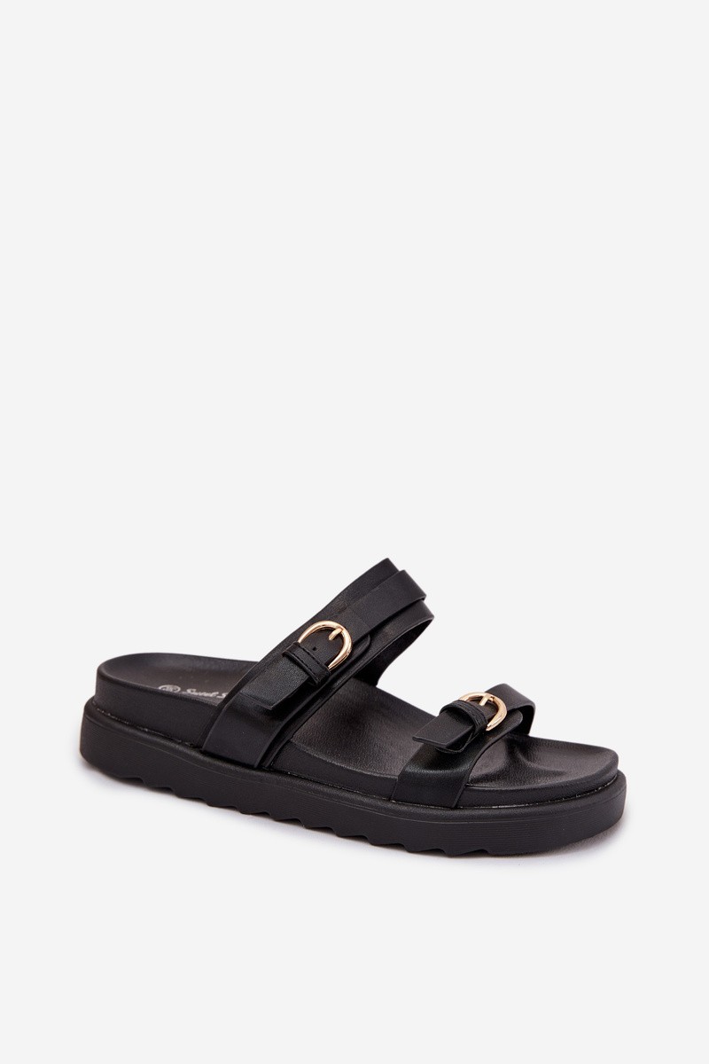 Moteriškos platforminės basutės su dirželiais ir auksinėmis sagtimis, juodos Rirea
