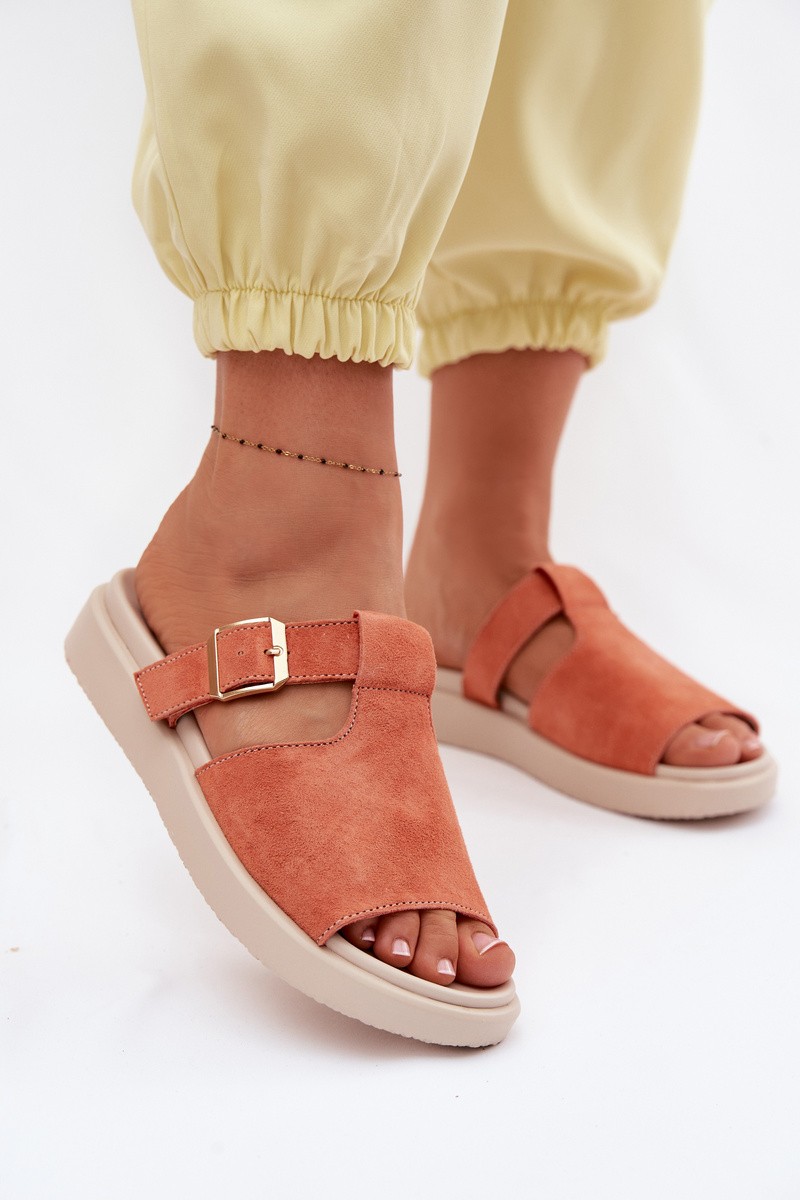 Women's slippers made from natural suede are a stylish choice for warm days. The soft, high-quality material gives them an elegant appearance while providing comfort for everyday wear. The model is set on a platform that gently elevates the silhouette and guarantees stability and walking comfort. The strap with a gold buckle serves both a practical and decorative purpose – allowing for a better fit and adding a trendy touch to the overall look. An ideal choice for women who value a combination of comfort, quality, and modern style. When choosing a size, please refer to the size chart.