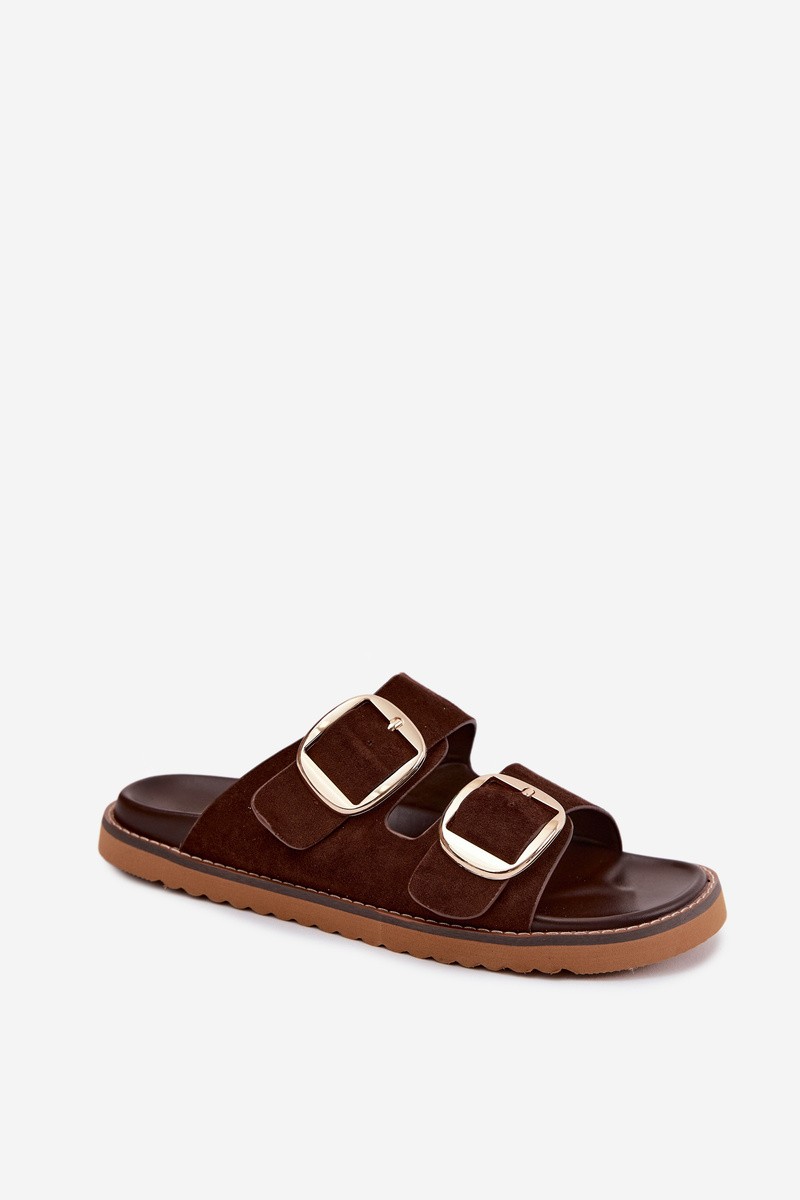 Women's Faux Suede Slides With Gold Buckles Chocolate Brown Averia