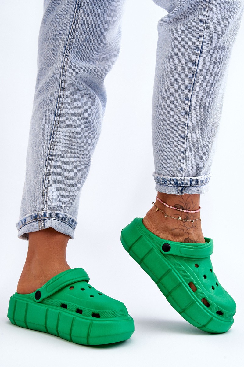 Moteriškos krokodilo stiliaus šlepetės pagamintos iš putplasčio medžiagos. Judinamas dirželis neleidžia pėdai judėti. Bateliai pastatyti ant masyvios platformos. Idealus modelis darbui sode arba naudojimui namuose vietoj šlepečių. Skylės viršutinėje dalyje užtikrina tinkamą avalynės vėdinimą, o tai puikiai tinka šiltesnėmis dienomis. Renkantis dydį, prašome žiūrėti dydžių lentelę.
